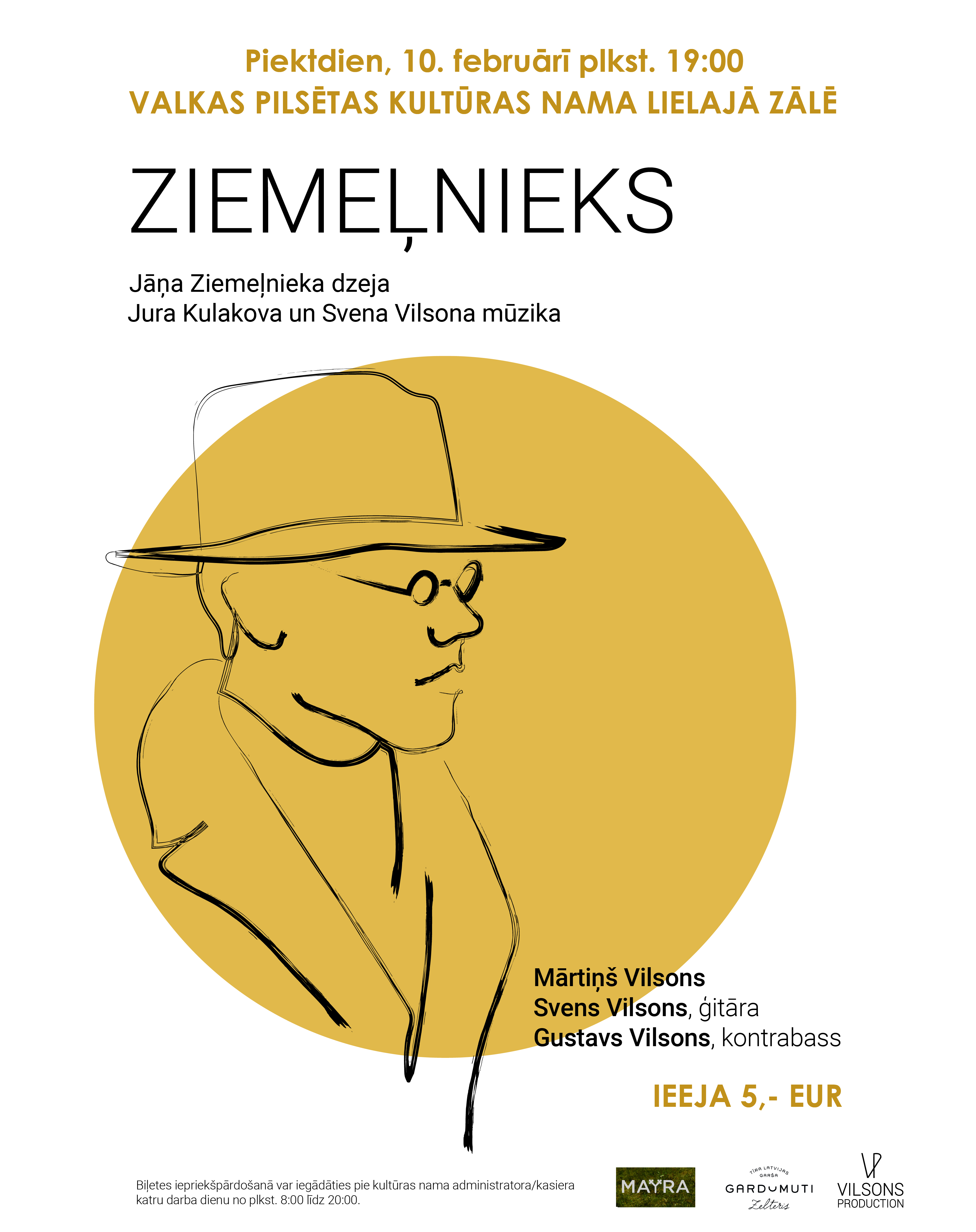 Biļetes iepriekšpārdošanā var iegādāties pie kultūras nama dežuranta/kasiera katru darba dienu no plkst. 9.00 līdz 17.00. Biļete maksā 5 eiro.