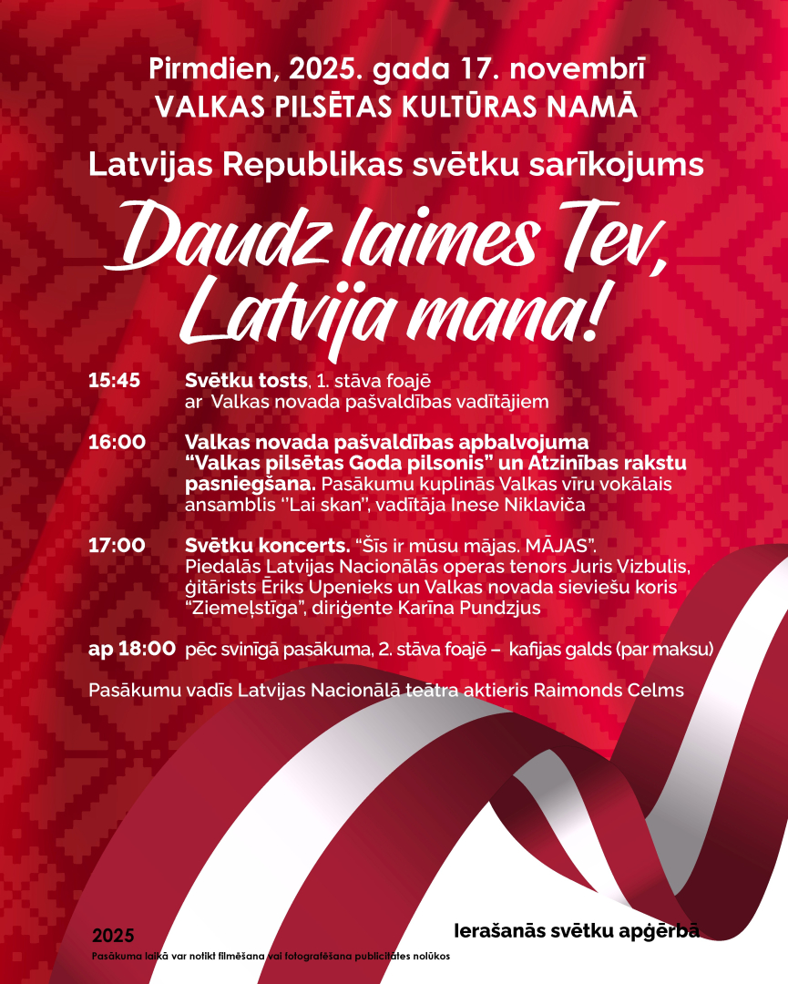 Pirmdien, 17. novembrī Valkas pilsētas kultūras namā norisināsies Latvijas Republikas Proklamēšanas 107. gadadienai veltīts svinīgais pasākums “Daudz laimes Tev, Latvija mana!”. Pasākums norisināsies trīs daļās.