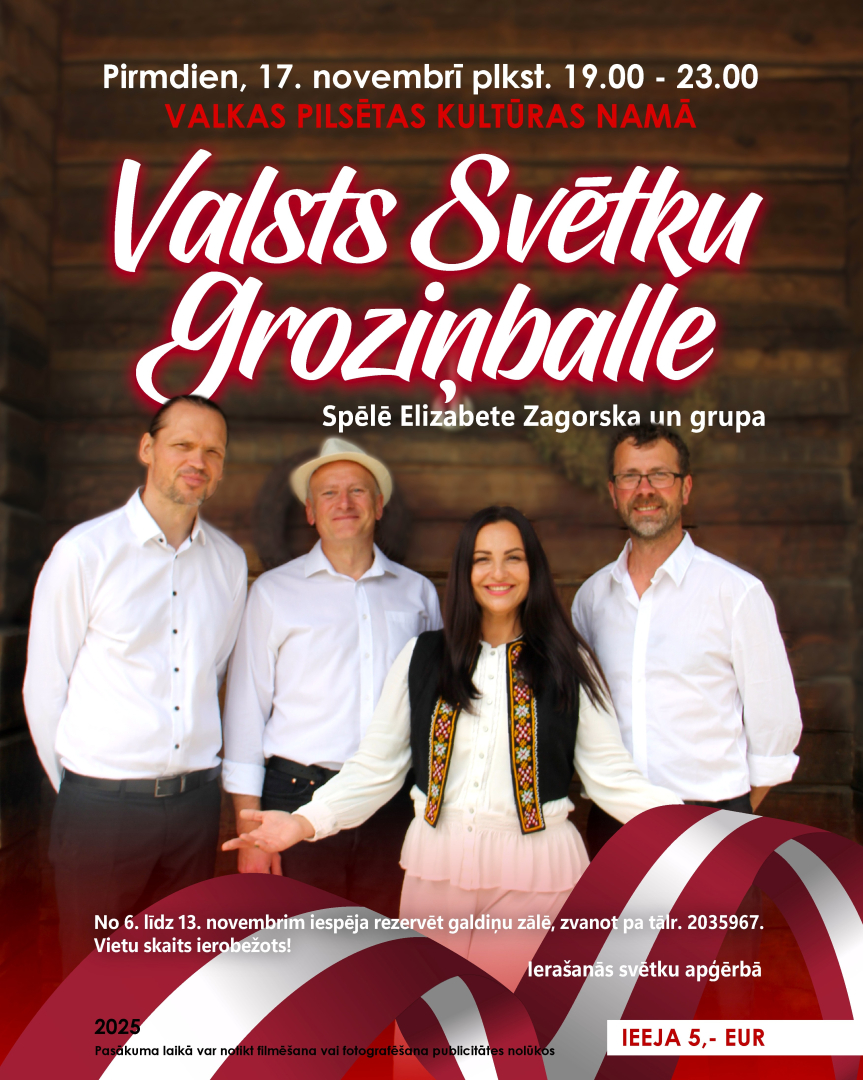 - No plkst. 19.00 līdz 23.00 lielajā zālē notiks Valsts Svētku Groziņballe. Muzicēs Elizabete Zagorska ar grupa.