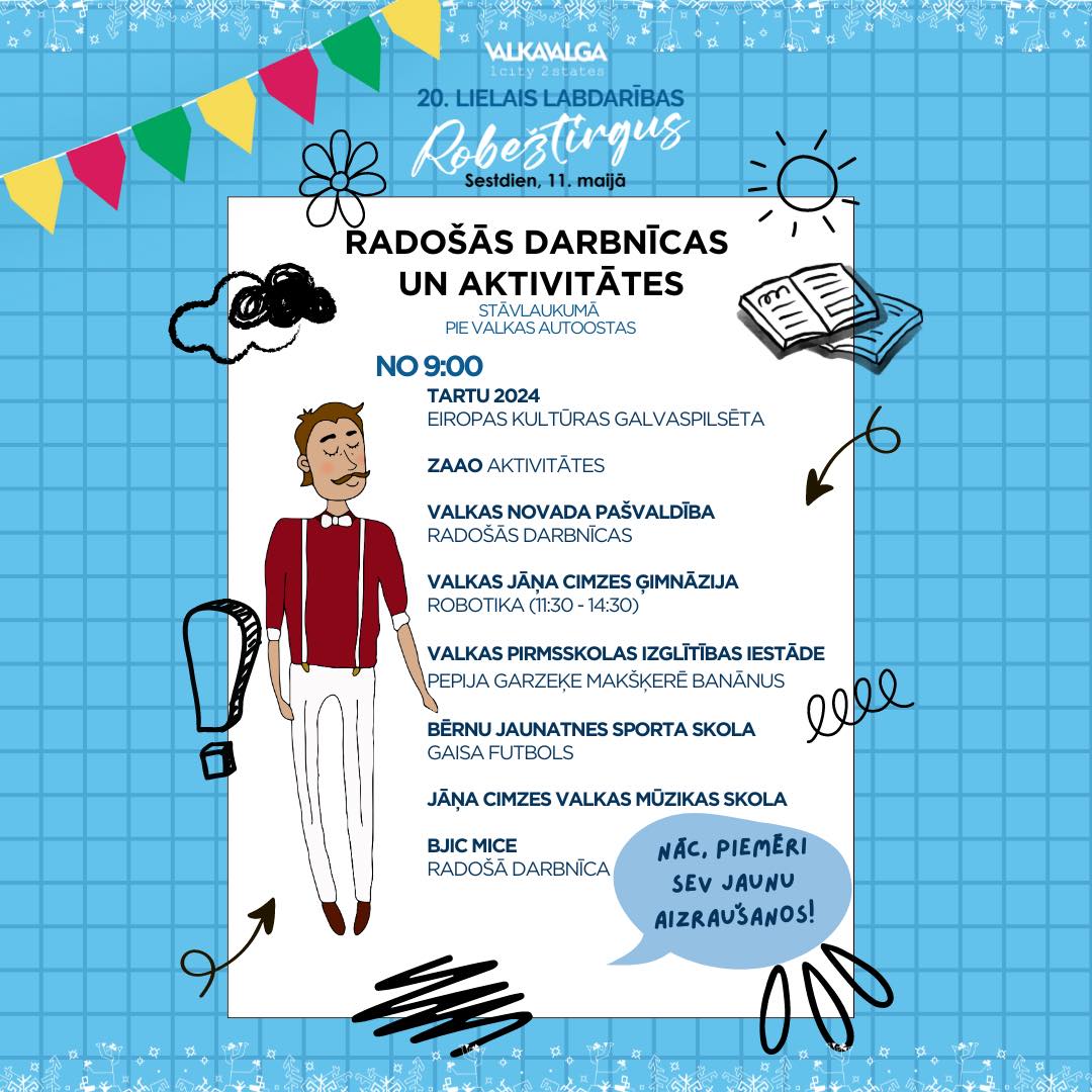 - 10:00-15:00 Valgas – Valkas Robežtirgus Jauniešu tirgus, Rotary loterija, radošās darbnīcas