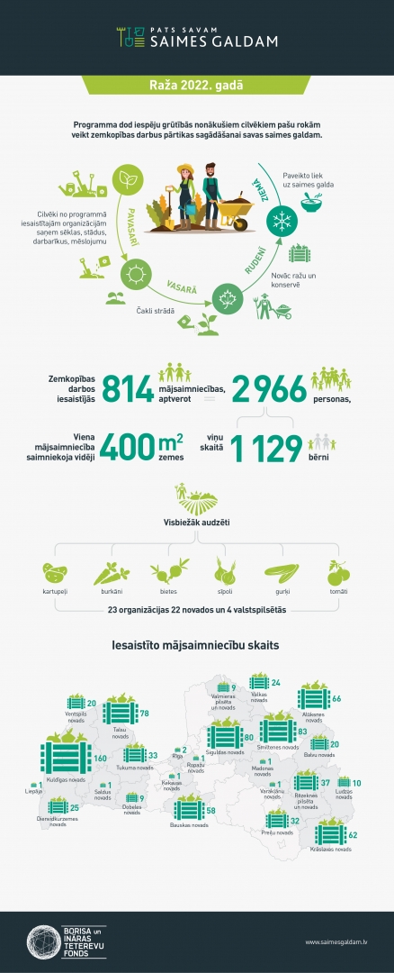 Noslēdzoties dārzkopības sezonai, bagātīgus krājumus ziemai ir sagatavojušas 814 mājsaimniecības visos Latvijas reģionos. Iesaistoties Borisa un Ināras Teterevu fonda programmas “Pats savam SAIMES GALDAM” projektos, tās pavasarī saņēma sēklas, stādus un dārza piederumus, lai izaudzētu pārtiku savam saimes galdam. Ļaudis atzīst – fonda atbalsts un pašu darbs ļauj būtiski ietaupīt līdzekļus. Vidzemē projektos iesaistījās 264 mājsaimniecības.
