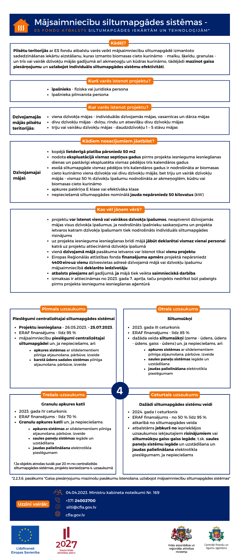 Šis ir otrais no četriem uzsaukumiem, kas paredzēti šajā ES fondu programmā – secīgi šajā un nākamajā gadā tiks izsludinātas projektu atlases arī granulu apkures katlu (š.g. 4. ceturksnī) un dažādu siltumapgādes sistēmu veidu (2024. gada 1. ceturksnī) ierīkošanai, ar iespēju projektos papildus uzstādīt arī saules paneļus.