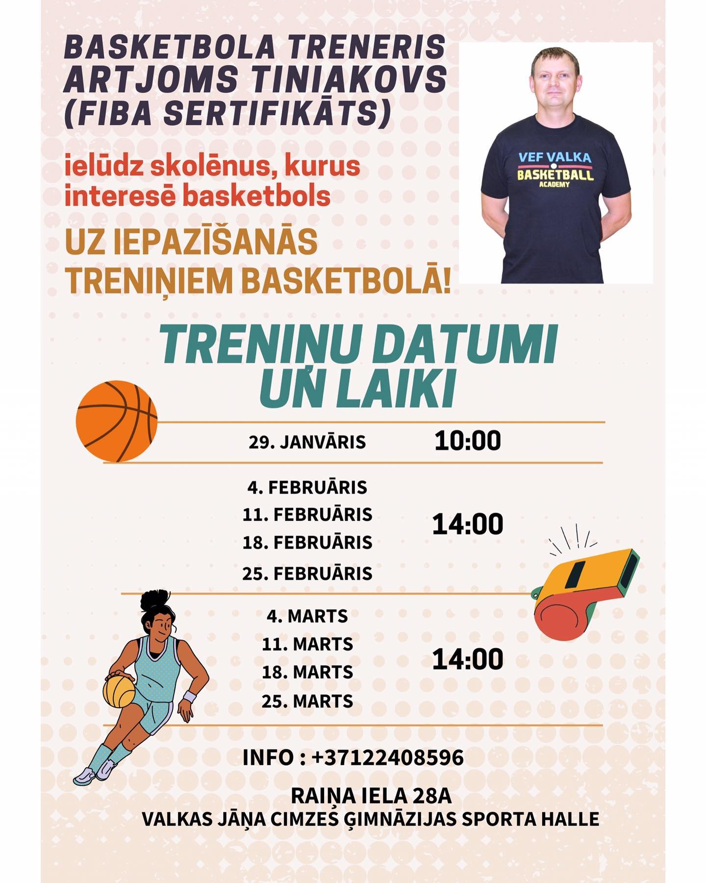 Basketbola treneris Artjoms Tiniakovs (Ukraina) ielūdz skolēnus, kurus interesē basketbols uz iepazīšanās treniņiem!
