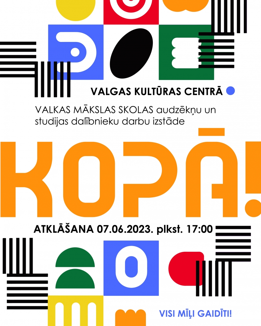 - plkst. 17.00 Valgas kultūras un interešu centrā - Pilsētas svētku un Valkas mākslas skolas audzēkņu un studijas dalībnieku darbu izstādes “Kopā” atklāšana