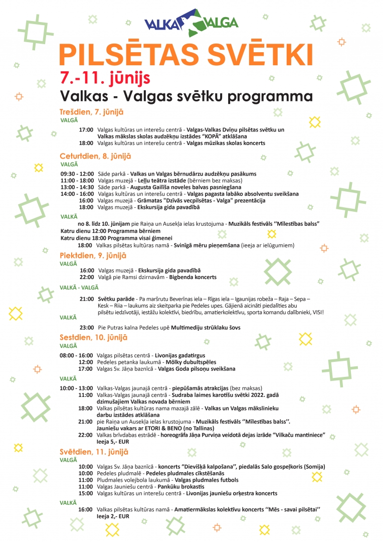 - plkst. 10.00-15.00 Valgas kultūras un interešu centra priekšā Kultūras programma