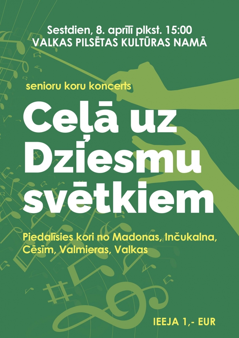8. aprīlī plkst. 15.00 Valkas pilsētas kultūras namā - Senioru koru koncerts “Ceļā uz Dziesmu svētkiem”. Ieeja - 1 eiro.