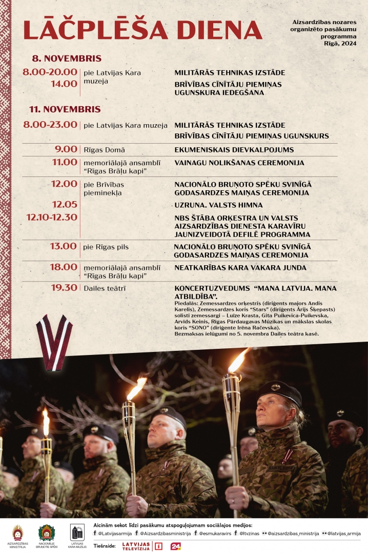 Pēc dievkalpojuma pulksten 11.00 aizsardzības ministrs Andris Sprūds un Nacionālo bruņoto spēku komandieris ģenerālleitnants Leonīds Kalniņš noliks vainagus Rīgas Brāļu kapos pie Mūžīgās uguns, ar klusuma brīdi godinot Latvijas karavīrus, kuri atdevuši savas dzīvības par Latvijas brīvību un neatkarību.
