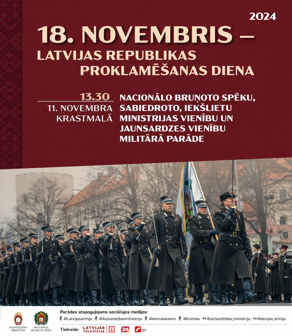Latvijas Republikas proklamēšanas gadadienā, 18. novembrī, aizsardzības nozare aicina Latvijas iedzīvotājus doties uz 11. novembra krastmalu vērot militāro parādi, kurā piedalīsies gan Latvijas, gan sabiedroto bruņoto spēku karavīri un militārā tehnika, Iekšlietu ministrijas pakļautības dienestu pārstāvji un tehnika, kā arī Jaunsardzes vienības.