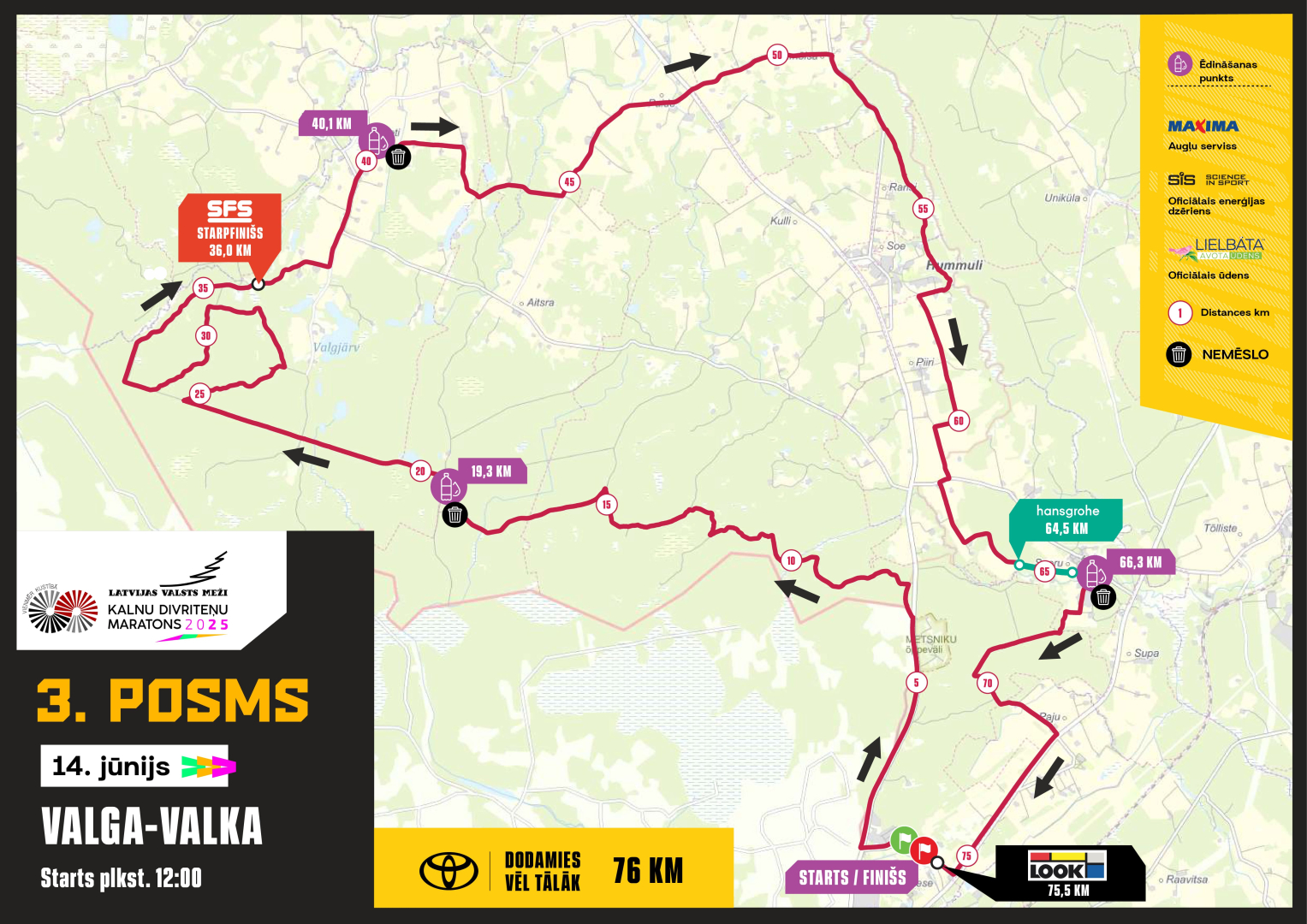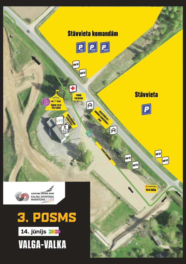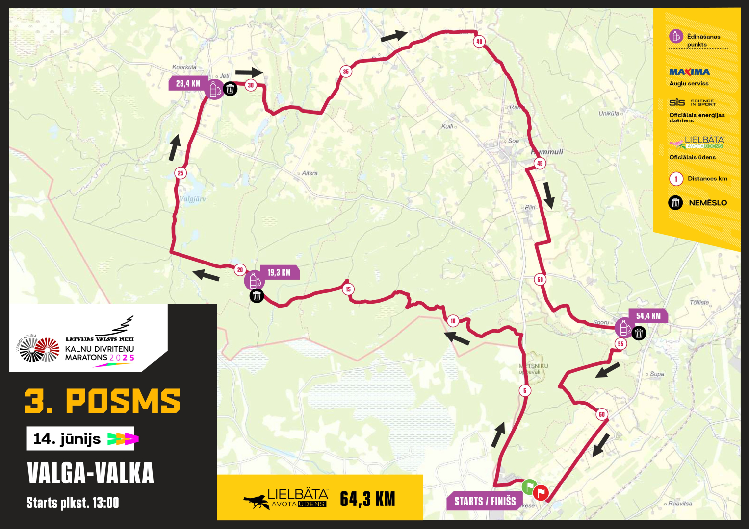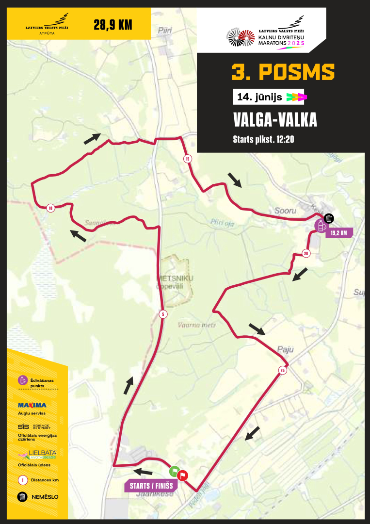 Plašāka informācija par Valga - Valkas sacensību posmu un kartes ar dzeršanas punktiem pieejamas šeit: https://velo.lv/kalnu-divritenu-maratons/