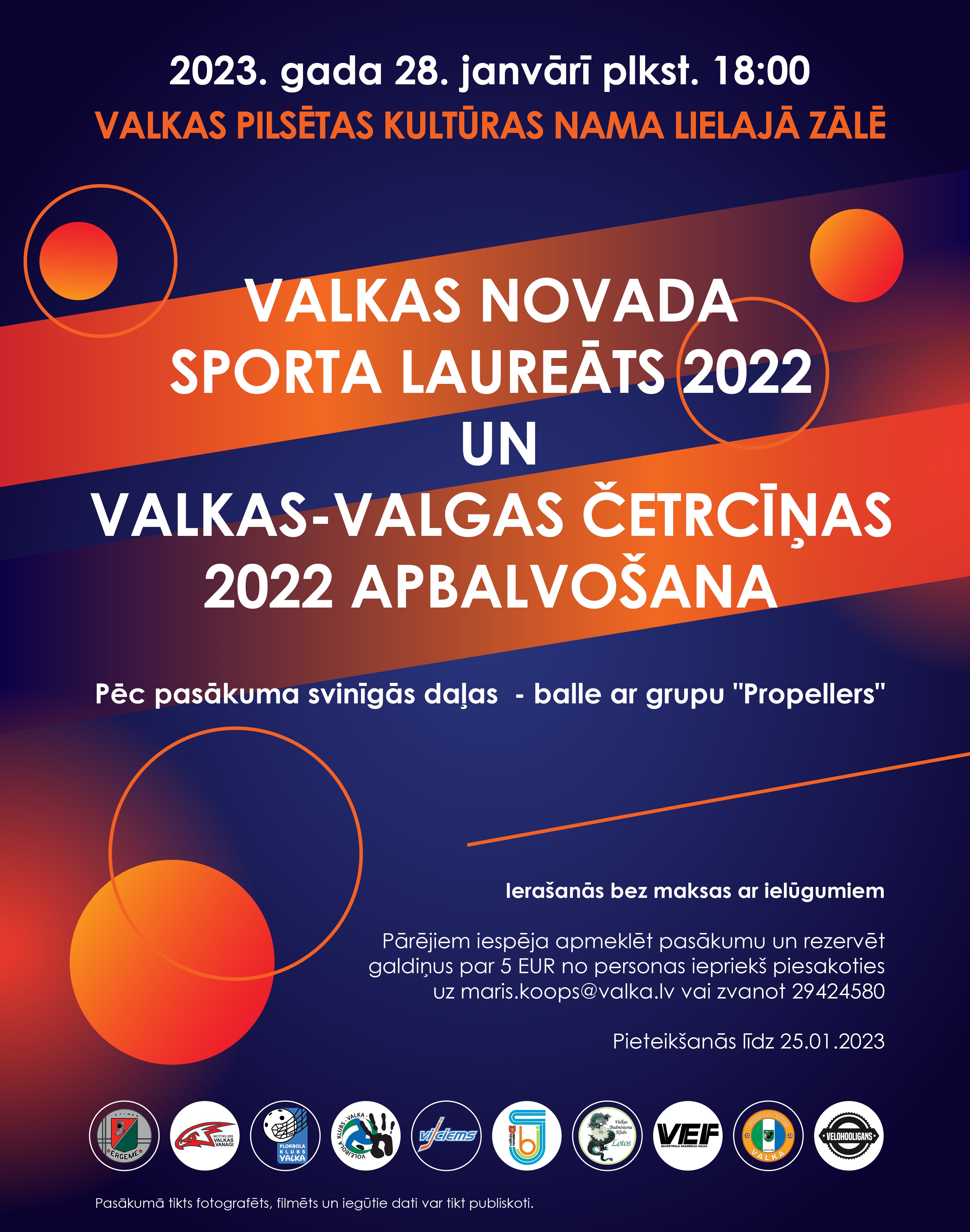 Rezervēt galdiņu iespējams iepriekš piesakoties pa e-pasta adresi sports@valka.lv vai zvanot uz tel.nr. 29424580 (Māris Koops) līdz 25. janvārim.