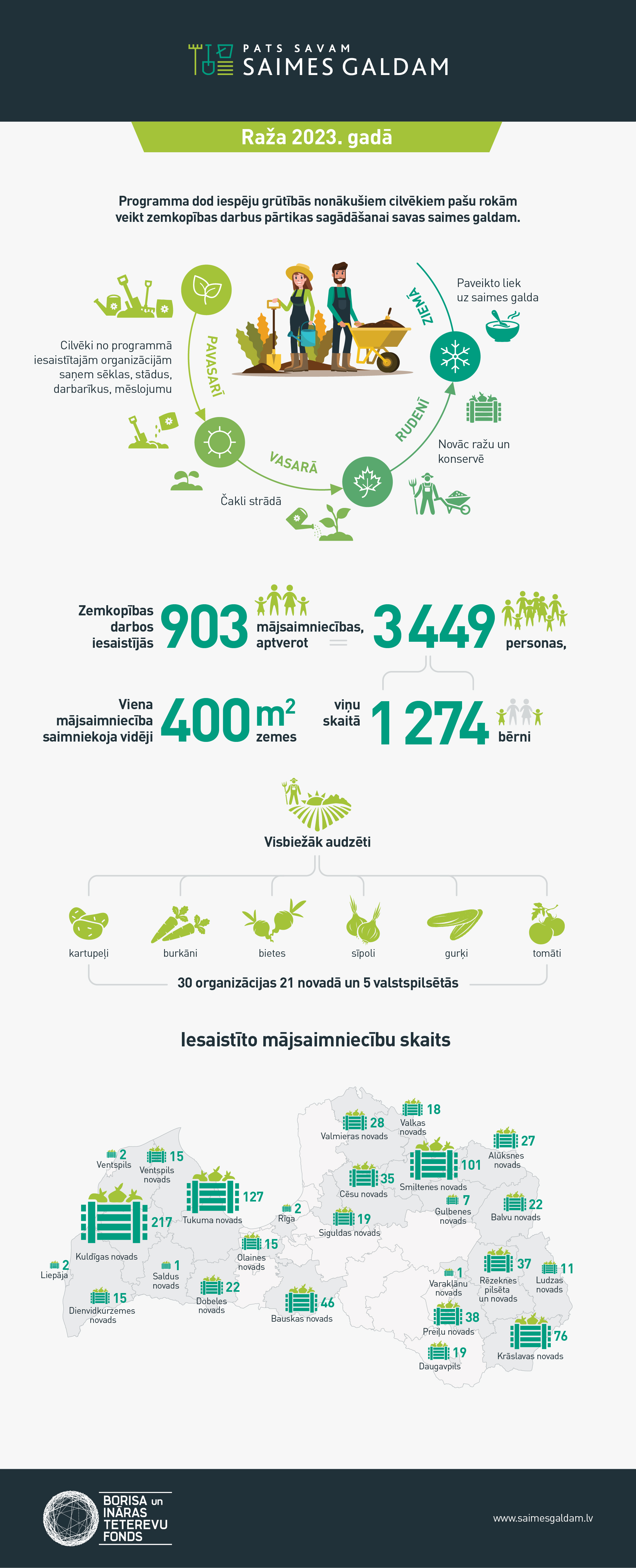 Kopš 2017. gada Borisa un Ināras Teterevu fonda programmā uzņēmīgajiem un rosīgajiem “Pats savam SAIMES GALDAM” atbalstīti kopā 112 bezpeļņas organizāciju dārzkopības projekti. Tajos iesaistījās 3`515 mājsaimniecības un tajās – 13`170 iedzīvotāji no visiem Latvijas reģioniem. Ar programmas ietvaros saņemtajām sēklām, stādiem un inventāru viņi varējuši sagādāt pārtiku sev un ģimenei.