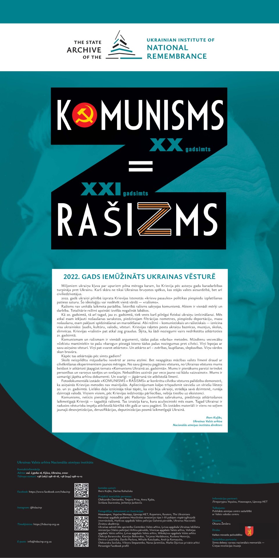 “2022. gadā ukraiņi pilnībā izprata Krievijas īstenotās “krievu pasaules” politikas piespiedu izplatīšanas patieso saturu. Šo ideoloģiju var nodēvēt vienā vārdā — “rasisms”. Rašisms nav unikāla laikmeta parādība. Īstenībā rašisms sakņojas komunismā. Abiem ir vienādi mērķi un darbība. Totalitārie režīmi apzināti izvēlās nogalināt labākos. Kā 20. gadsimtā, tā arī tagad, jau 21. gadsimtā, tiek vests karš pilnīgai fiziskai ukraiņu iznīcināšanai,” izstādes ievadvārdos vēsta Ukrainas Valsts arhīva Nacionālās atmiņas institūta direktors Ihors Kuļiks.