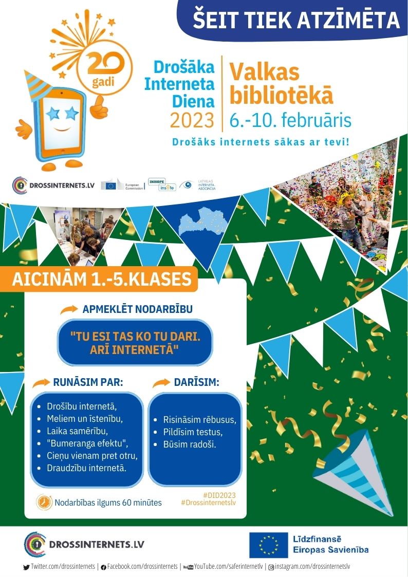 Jau 20. reizi 7. februārī visā pasaulē tiks atzīmēta Drošāka interneta diena (DID2023). Ik gadu Latvijā, par godu šai dienai, Drošāka interneta centrs sadarbībā ar Latvijas bibliotēkām, skolām un jauniešu centriem, piedāvā dažādas aktivitātes, kuru mērķis ir aktualizēt jautājumus par drošu interneta izmantošanu bērnu un jauniešu vidū. Pievienojoties šī gada sauklim “Drošāks internets sākas ar tevi!”, Valkas bibliotēka aicina jauniešus apmeklēt nodarbību, kurā pārrunāsim ar drošību tīmeklī saistītos tematus – meli un īstenība, laika samērība, “bumeranga efekts”, cieņa u.c., risināsim rēbusus un pildīsim testus. Noslēgumā, par kādu no apspriestajiem jautājumiem, būs radošs uzdevums.