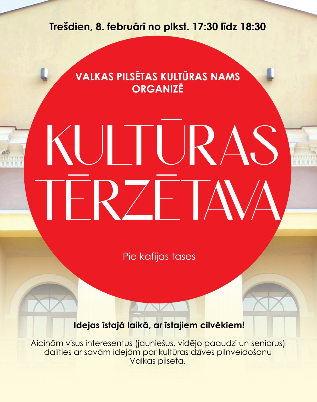 Trešdien, 8. februārī, no plkst. 17.30 līdz 18.30 Valkas pilsētas kultūras nama otrā stāva foajē aicinām visu paaudžu interesentus uz diskusiju “Kultūras tērzētavā pie kafijas tases”- Idejas īstajā laikā, ar īstajiem cilvēkiem! Par kultūras pasākumiem un to norisi Valkā aicina Valkas pilsētas kultūras nams.