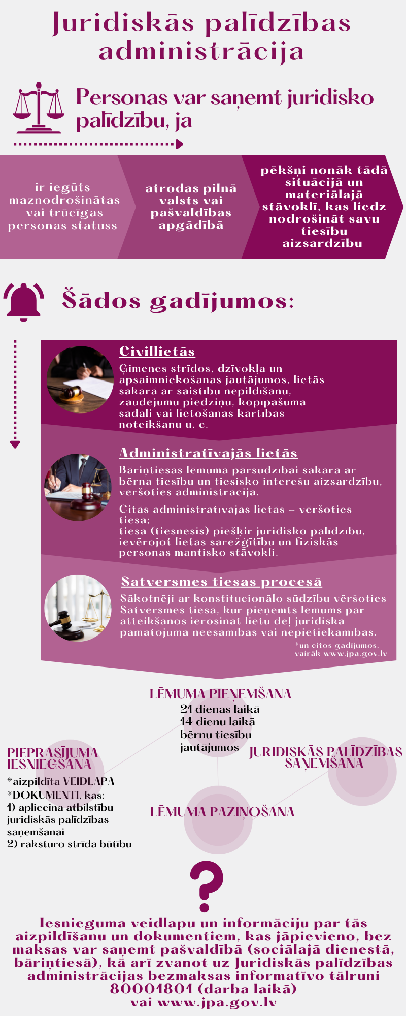 Fiziskām personām, kuras ir iesaistītas juridiskā strīdā un tām trūkst līdzekļu jurista pakalpojumu saņemšanai, Juridiskās palīdzības administrācijā var vērsties valsts nodrošinātās juridiskās palīdzības saņemšanai. Administrācija norīko juridiskās palīdzības sniedzēju un apmaksā sniegto juridisko palīdzību noteiktajā apjomā.