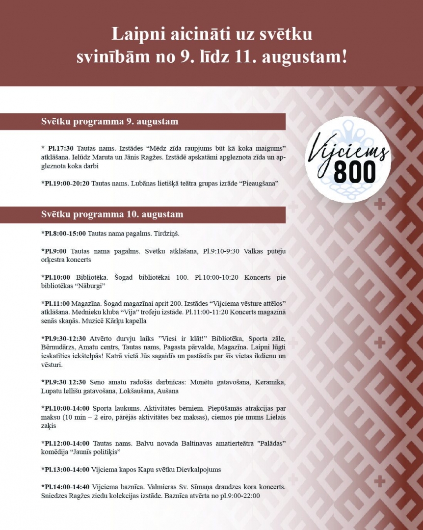 No 9. līdz 11. augustam ar plašu un daudzveidīgu kultūras programmu Vijciems atzīmēs 800-gades jubilejas svētkus.
